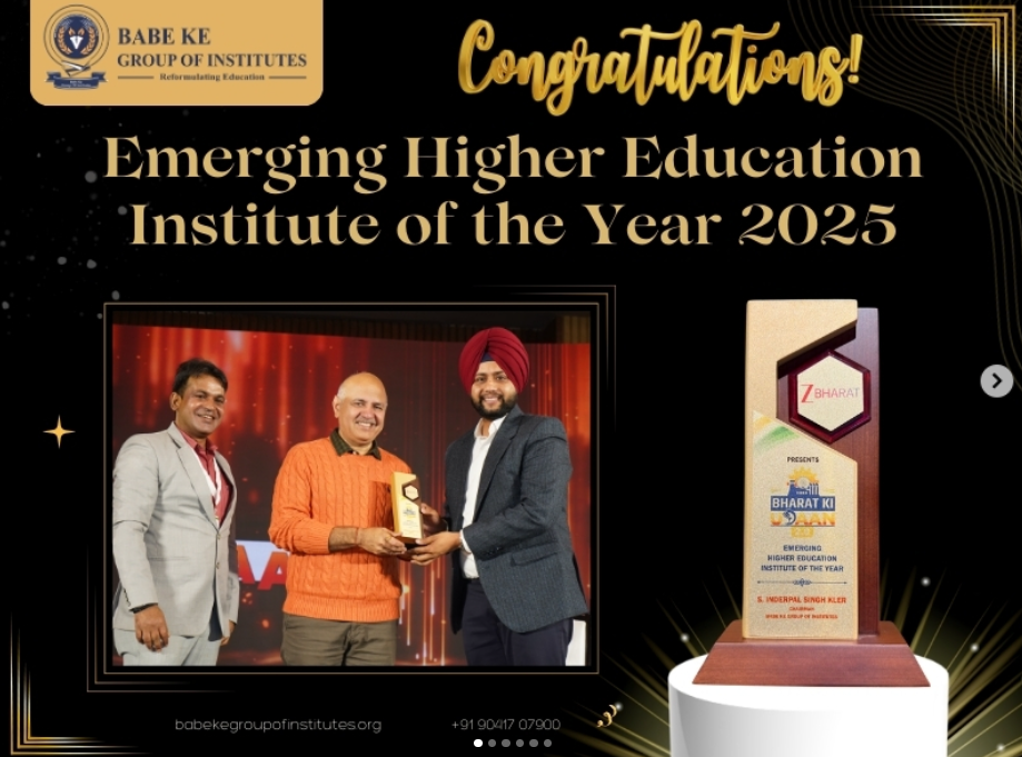 | S. Inderpal Singh Kler, Chairman, Babe Ke Group of Institutes, has been conferred with the prestigious “Emerging Higher Education Institute of the Year” award at Bharat Ki Udaan 2.0, held on 16th December 2025 by Shri Manish Sisodia Ji, Former Deputy Chief Minister of Delhi, | Gems of Malwa Award organised by the Dainik Jagran Group to S. Inderpal Singh Kler, Chairman, Babe Ke Group of Institutes for Visionary Leadership by S. Kultar Singh Sandhwan, Hon’ble Speaker, Punjab Vidhan Sabha | Gems of Malwa Award organised by the Dainik Jagran Group to Dr. Ashwani Kumar Bhargava, Principal, Babe Ke Ayurvedic Medical College and Hospital for Healthcare upliftment by S. Kultar Singh Sandhwan, Hon’ble Speaker, Punjab Vidhan Sabha | Gems of Malwa Award organised by the Dainik Jagran Group to Dr. Manoj Maurya, Babe Ke Group of Institutes for Healthcare upliftment by S. Kultar Singh Sandhwan, Hon’ble Speaker, Punjab Vidhan Sabha |